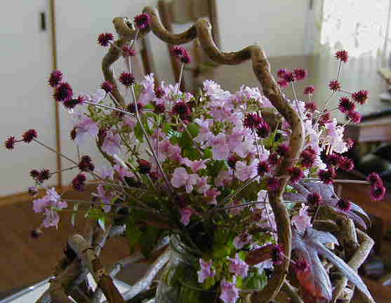 | 1/14(日) | 宿根ネメシアと千日小坊をカットしました。ネメシアはまた3〜4月に咲いてもらいたいから、小坊は成長が止まったように思ったから。切花にしてはじめて分かったのですが、このネメシアいい香りがします。 今、薄ピンクとプラム色の組み合わせに凝ってます。なんだか落ち着くの。 ストックもちょこちょこ切ってそのいい香りを楽しんでいます。 |