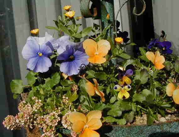 | 1/22(月) | ベランダは春のよう。 昨日今日と寒さが緩んだので久しぶりにハンギングを作りました。こんな日を待っていたんだぁ、気分まで明るくなります。昨日はいろいろ使って円錐形のを、今日はプチバスケットをパンジーで3つ作りました。 春のオープンガーデンが4月に決まったので今月中にパンジーは植えてしまわなければ。 |