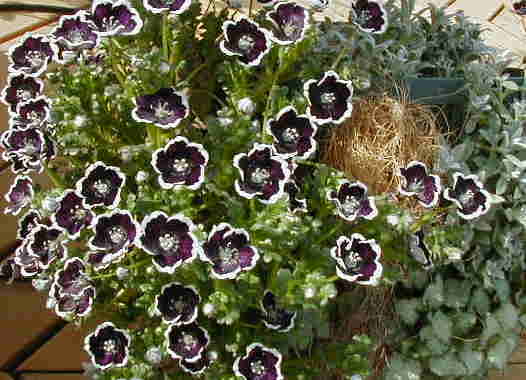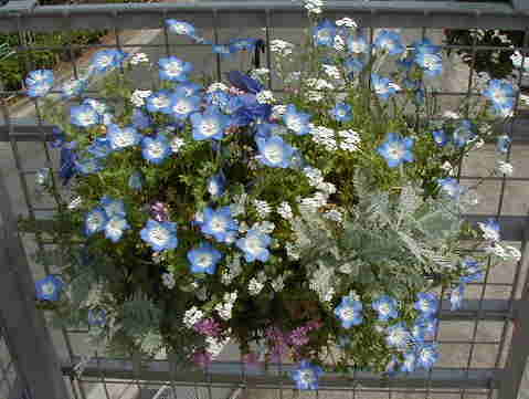 | 4/5(木) | ハンギングに入れたネモフィラ・ペニーブラック(メンジージ・ディスコイダリス)が山のように大きく育ってしまった。そうなると分かっていたので、小さい貧弱な苗を植えたのに・・・しかも、寄せたものが5月に入ると咲くセラスチウム。「これって失敗?」と思いつつ、セラスチウムが咲くまでがんばってもらうためにネモフィラを半分のボリュームにカットしました。なんとか一緒に咲いているところが見たいよ〜。 今日は屋上の整理整頓で1日かかりました。週末に屋上でお花見バーベキューの予定なの。お天気どうかな? そろそろペチュニアやフクシアやロベリアのハンギングを作りたいなぁ。でも、バスケット空いてないんだなぁ〜、どうしよう・・・ |