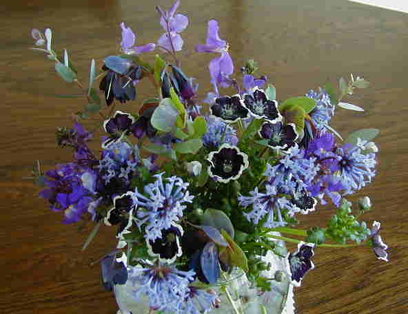| 4/7(土) | 黒いネモフィラが続いてしまいますが、久しぶりの下手くそアレンジメントです。後ろに紫はなな、葉物はユーカリ、セリンセとリナリア、アスペルラで一応色は統一感あるつもり。こぼれ種からのアスペルラがふわふわ咲いて屋上はいい感じ。バーベキューも暑いほどのお天気で桜も満開でよい休日でした。午前中にはるかまま主催のハンギングコーナーを見に西区の桜祭りに。植木屋さんや花屋さんも出ていて園芸相談コーナーや寄せ植えコーナーもあり、知り合いに話を聞くと、そのまんま家の前の公園(須磨区)で明日催しをやるそうです。また見に行こっと。ヒマな私。 |