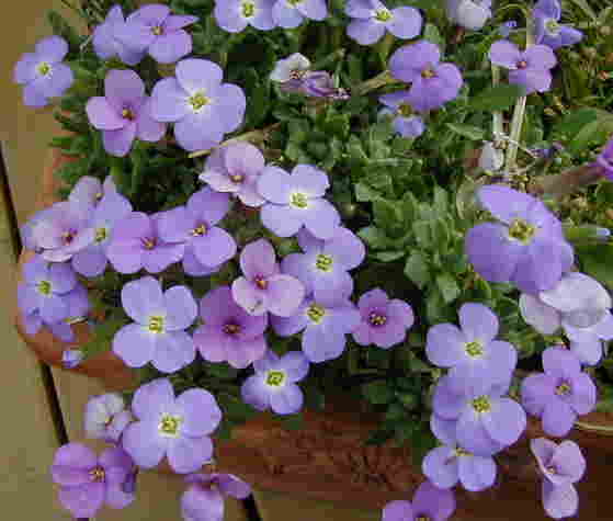 長い間ハンギングの中に入れていたオーブリエティアがこんなに綺麗に咲きました。この間まで貧弱な姿で少ししか咲いていなかったのに・・・一緒に植えていたフレンチラベンダーも斑入り葉のディモルフォセカも2月ころ植え替えたものがもの信じられないくらい大きくなっています。狭かったのね〜、ごめんね〜。 黒花フウロ/ポッタライラック/姫扇?/ナデシコブラックベア 今日はオープンガーデンのお手伝いをしてくれた友達にプレゼントするハンギングを2つ作りました。自分のも2つ。昨日も2つかな?もう置くところが無いくらいです。 |