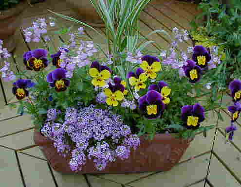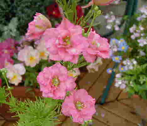 家のビスカリア達。いちばん左は隣のチェリーブロッサムが褪色してピーチブロッサムになったもの。(笑) ビスカリアのハンギングも作ったのですが、写真ではいまいちなのでパス。この全種類が入ったプランターは眩しいくらいの明るさで、5月の日差しの中でキラキラと輝いてなかなか綺麗です。普通の花も捨てたものではないですね。まぁ、私に言わせたら可愛くない花は無いのですが・・・見ていただきたいのはくるりと巻いた”ヒゲ”(オシベ?)。これが表情豊かで可愛さ倍増なのです。 昨日やっとパンジーの撤去を終え、今日は久しぶりに夏服を仕入れに阪急へ(いつも買い物と言えば”花”だもんなぁ・・・)。気分よく帰ってきて夕方寄せ植えを3つ作りました。今日は珍しく冴えてたぞっ! |