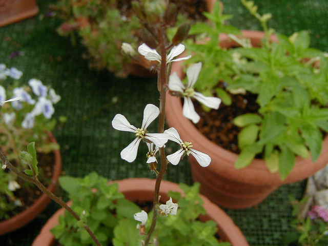 ルッコラは他の花にはない野性っぽさと風変わりでいて品の有る、なんともいえない魅力が気に入って。 花の色もクリームに緑が入っていい感じ。ごま風味で美味しいらしいけど、虫だらけで食べる勇気が・・・ |