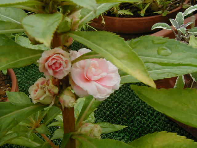 何日か前からセミの声が聞こえる気がしたのですが、今日はクマゼミの声で確認。もう本当の夏なんですね。 今日は庭仕事のフルコース。買い物・種まき・ポット上げ・植え替え・花がら摘み・そしてハンギングを4個作りました。疲れたぁ〜 写真左:フレグランスミックスの種から咲いたホウセンカ 写真右:モルセラ これでも咲いているのよ。 |