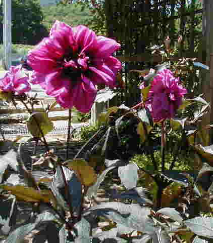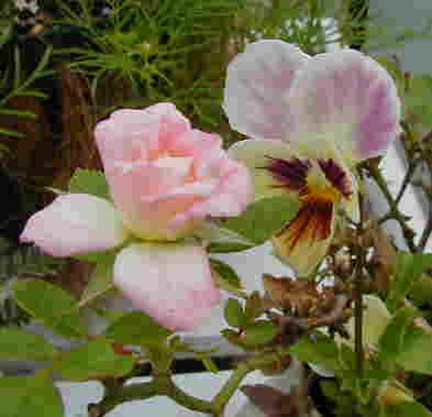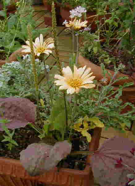 | 7/10(火) | 黒いホリホックが咲きましたが、穂が伸びず根元の方に花が。これは失敗なのか? 家の唯一のバラ、ミニバラと勝手に咲いているパンジー。 昨日はりきってコリウスなどの挿し芽苗でハンギングを5個くらい作りました。 今日はお出かけで何もせず。夏のハンギングは遠くから見たら緑色ですごい地味。インパチェンスだけが色がパッと出るけれど、屋上のインパは枯れてきてるような。涼しそうにと白い花を使うとホント緑になっちゃうんです。夏の計画っていつもしてないから「夏はしのぐもの」って感じ。 |