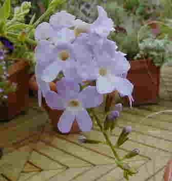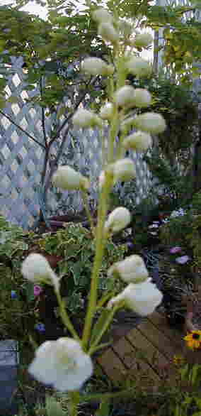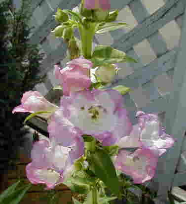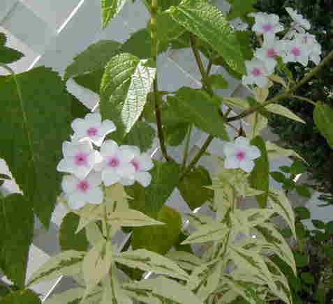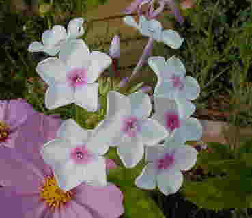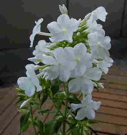 | 7/8(日) | またまた新しい種類のペンステモンが咲きました。白に優しいピンクの輪郭で、まさに癒し系ペンステモン!ミニひまわりは草丈15cmほど水切れさせて葉が枯れ枯れでお見せできない。フロックスは斑入り葉を挿し芽してあったのに斑入りの部分は小さく育たず、みごとに黄緑色の葉になったものが元気で一番に咲きました。でも、花がかわいいからいいや。 昨日はマスター会で名古屋まで。リンクのページの青木先生の生ハンギングを見ることができました。懇親会で壁の花になっていたアニスを輪に入れてくだった三重支部の皆様、ありがとうございました。もう三重支部に入っちゃおうかしら? |