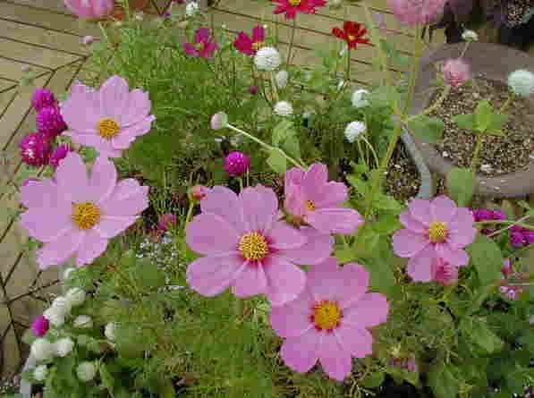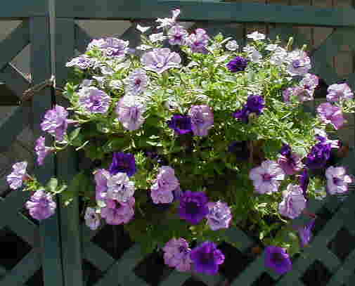 | 7/26(木) | なんとか咲いているサフィニアのハンギング。1回咲いて切り戻してまた咲いたけれど、もうすでに伸び伸び。右はコスモス、センニチコウ、アガスターシェの寄せ植えを2つ並べています。これはもしかして家の中で一番華やかな部分かもしれない・・・ 昨日今日と夜に涼しい風が吹いていていい気持ちです。 実は先週「HB−101」を買いました。観察が足りないので効いているかどーか分からないのが辛いとこ。ハンギングも作ってないし、「オーッ」っていう効き目が見てみたいです。アトピーッ子の娘にも右半身だけ塗って実験中。 |