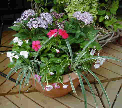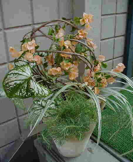 | 7/30(月) | 左は弟夫婦への新築祝いの寄せ植えです。ブーゲンビレア、カラジウム、リリオペ、ユーフォルビアで。 右は帰省土産用。実家の母は華やかな色が好きなのでペンタスにビンカを4色とヒポエステスとリリオペ。 真夏の帰省なので寄せ植えのお土産は無しと思っていたら、「何でもいいから持って来て」というリクエストがあり急きょ昨日買出しに行って今日作りました。 Oh!そうだこのしおれたビンカにHB−101をやろう。 右下のイポメアを花瓶に挿しておいたら2日で発根していたので今からどんどん増やしてニコチアナの後釜はコレにしよう!実家にも持っていってあげよっと。 |