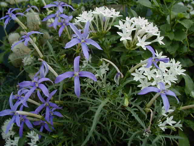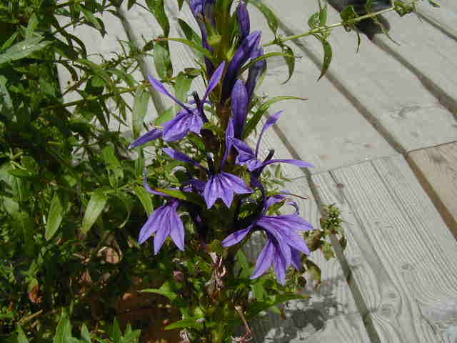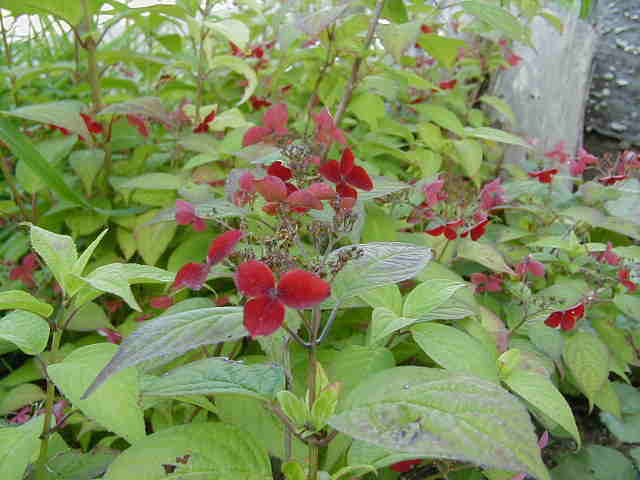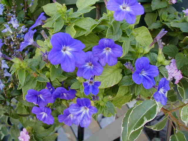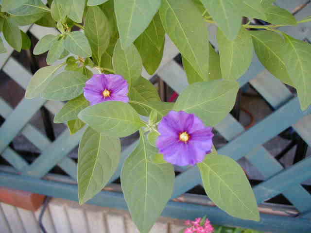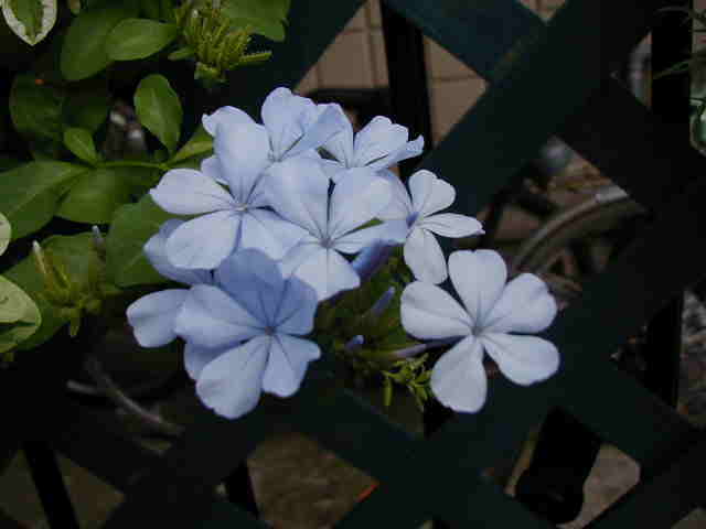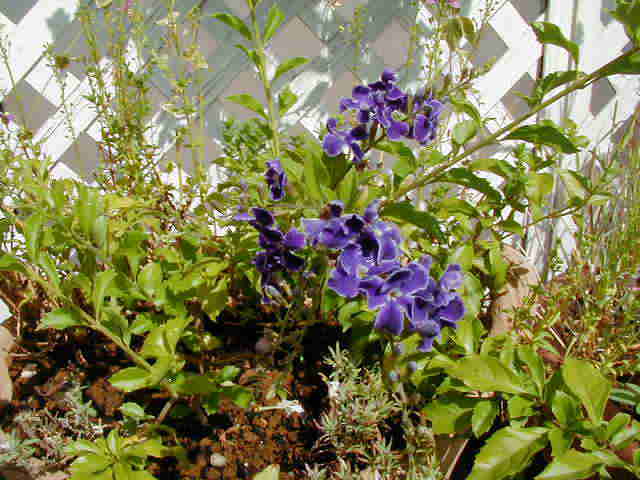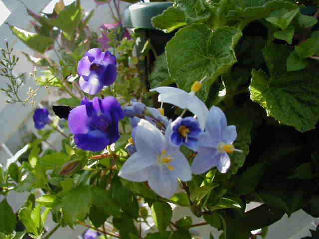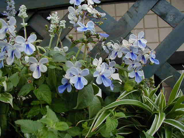| 8/10(木) | 今年の夏は屋上をピンクガーデンにする予定でしたが、どれも暑さで元気ないの。そのかわり北側のトレリスはブルーの花たちが元気に咲いています。 左 ヤマホロシはじゃがいもそっくりな花。 右 ブルーエルフィンはすごい元気で次々に蝶のような花を咲かせています。新しい芽が出ている上をカットして大きくせずにハンギングで楽しめます。 ブルーエルフィンにはたくさんの名前があります。ゲンペイボク・源平臭木・バタフライフラワー・クロデンドロン ウガンデンセ(学名)などなど・・・冬越しは簡単とお店の人は言ってたけど、夏にこんなに元気ということは”危ない”と思います。ちなみに九州のお友達は冬にダメにしたそうです。 |