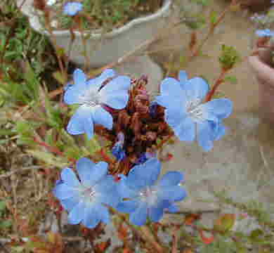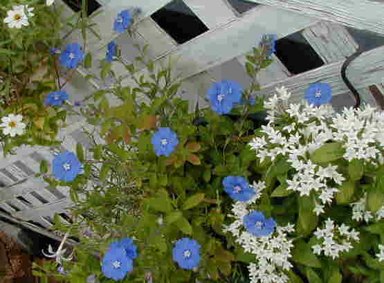 | 9/16(日) | 8月の終わりからアメリカンブルーが復活してよく咲いています。フェアリーベルのほうは真夏も休まずでした。やっぱり小花はかわいいな〜、フェアリーベルがアサギリソウとお似合いです。 昨日ホームセンターで捜していたバラのひとつ”カーディナルドリシュリュー”を発見!胸がドキドキ高鳴り、「これから私の2度目のバラ生活が始まるのね」と思いました。が、よく見るとうどん粉病だし元気も無さそう。迷いに迷って買わずに帰ってきました。どうしたもんかなー、今は病気でも来春までに立派に育てればいいのかしら?悩むなぁ。 今日は久しぶりにお花友達といつもの友達を呼んで屋上バーベキューをしました。よく見るとお庭はゴミダメのようでぜんぜん綺麗じゃないの。友達にどのハンギングをコンテストに出すの?と聞かれ、「見ればわかるでしょ、良いの無いのよ」と答えたの。幾つか作ったけど、客観的に見ると良いの無いのです。私には可愛く見えるんだけどなー。 チューリップの球根を少しだけ買いました。今日いらしたお花友達はもう植えたそうです。(早い!) |