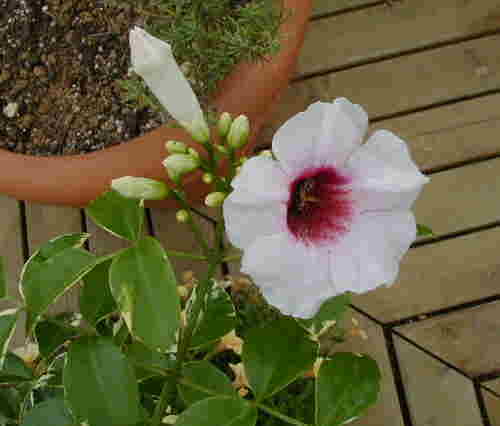 | 9/6(木) | 去年買うのが遅くて咲かせられなかったパンドレアが今ごろ咲きました。ほったらかしのままで名前さえ忘れかけで何者なんだろう?夏の間花を休んでいたツンベルギアに蕾の形が似てるし、同じ頃蕾がついたので仲間なのかな? 今日はすま花ネットの「種まき講習会」の日でした。また花ネット最新情報で様子をのぞいてみてね! 初夏に咲いていたワイルドフラワーのカンパニュラがまたちらほら咲き出して得した気分。9月になって雨が降り、こぼれ種のシレネ・ピンクピルエットの芽が出てきました。また今夜からの雨で何か出てくるかな〜?楽しみ! |
