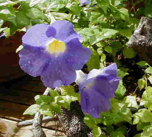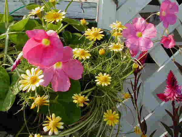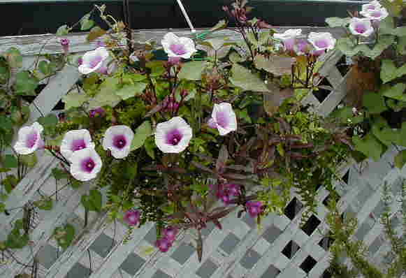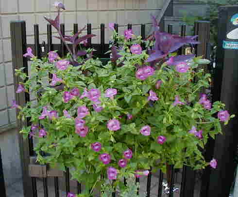 | 9/14(金) | イポメア”花らんまん”の挿し芽で作ったハンギングを2つ並べています。今日はたくさん咲いていました。 ”ブルーが好きでしょ”とよく言われますが、花の色はブルーから紫とピンクも好き。でもこの花の中心のように赤紫っぽいピンクにすごく惹かれるんです。バラもこんな色のを捜しています。 昨日、今日とハンギングを2個ずつつくりましたが、もう飾るところも容器自体もほとんど無い〜〜。で、どんなのを作ったかといいますと・・・一寸法師の、アカリファ(キャッツテール?)の、ヒメツルソバのとオキザリスのです。 種がこぼれてビオラが咲きだしました。雨が降って空きプランターにはリナリアやビスカリア、ニゲラ、忘れな草などが顔を出しています。 |