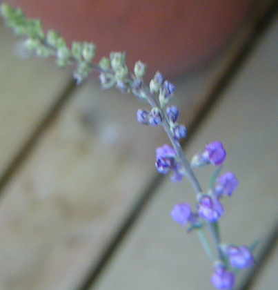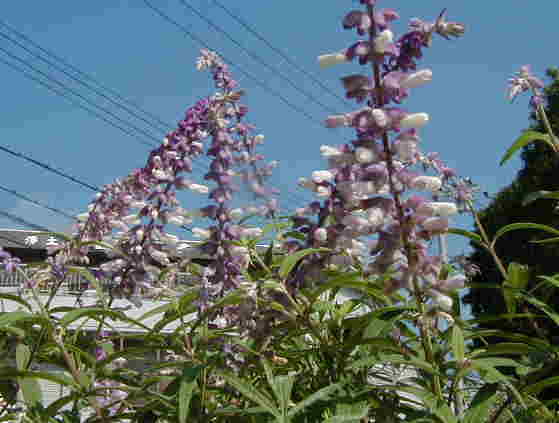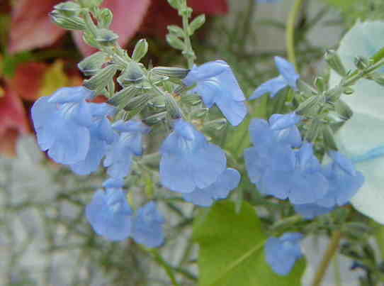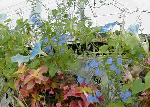 イポメアがハンギングを覆うように旺盛に生育している中にまるでツルの様に入り込んで咲くサルビア・アズレア。手の施しようのないくらい絡まってジャングル状態ですが、けっこうそれが気に入っています。それにしてもアズレアの透き通った水色というか空色というかが素敵です! |