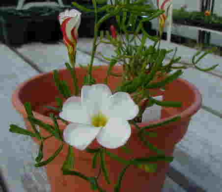 | 10/24(水) | オキザリス・バーシカラーは去年のものはお亡くなりになり、これはご近所さんに頂いたもの。フニャフニャしている割に強い性質と思っていたけれど、球根が腐ってしまったのかな? ヘブンリー・ブルーは今頃去年のこぼれ種(?)で咲きました。 雨は降るわお出かけが続くわで外回りの花がら摘みをサボっていたのですが、今日はほんの10分してみました。トレニアなんて花がら全部はとりきれませんでした。”ダブルのベゴニアに吸い寄せられて来ました”という方とちょっとおしゃべり。ニコチアナ・シルベストリスとアルテナンテラの種をさし上げました。 私は今日、花ネットのお姉さまにコキアの種を頂いたの。(というか、勝手に枝からしごきとった)コキアには白(緑)と赤があると思ってたんだけど、あれって緑が赤に紅葉するんだって。知らなかった〜〜 |