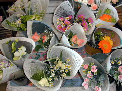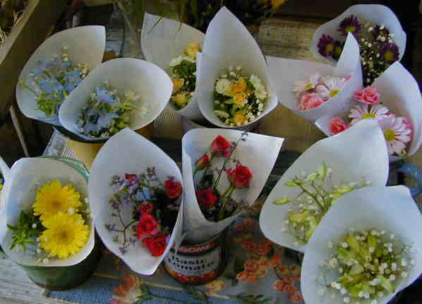 こちらの写真は9月に私が撮った写真です。 どのブーケも色合いや組み合わせが素敵で、黄色やピンクのグラデーションも水色のデルフィも赤のバラもどれも欲しくなります。テーブルにこんな花を絶やさないようにしたいものです。150円でしあわせが買えるって感じです。 |