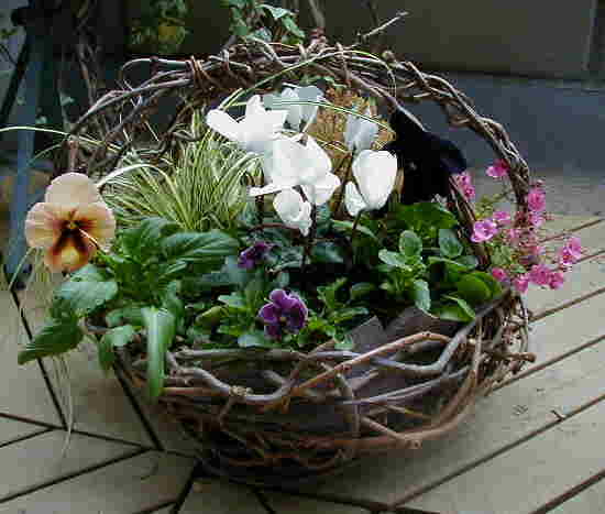 | 11/15(木) | アケビのツルで編んだバスケットにシクラメンの寄せ植え。黒いパンジーが見えますでしょうか? 昨日・今日とプチバスケットを3つずつ計6個をオルキメインで作りました。セージやデュランタ、プルンバゴなどを鉢に植え替えて冬越し準備。空きプランターに生えていたタマクルマバソウやネモフィラをポット上げしたり、2つ植えしてあったムラサキハナナ、ポピー、ゴデチアなどをひとつにと細々働いたのであります。あっ、パンジーやストックの黄色い葉を取り除いてそこに肥料を置く作業もしました。恐怖のふるいかけも毎日少しずつ(プランター2つか3つくらい)してほとんどのプランターや鉢は再生土で作ります。 今まで土の小袋を入れていたプラスティックのコンテナ(道具入れ)にハンギング用の土を作ってたくさん入れてみました。これが便利で、ちょっと土が欲しい時にも使えるし、ハンギングを作る度に土を作らなくていいので楽チンです。 蓋つきゴミバケツの大きいのを買ってコンテナ用の土も作り置きしようかな。 それにしてもストック・パークアップルブロッサムが咲かないんですが、これって春咲きなのかな?楽しみにしてるんだけどなー。 |