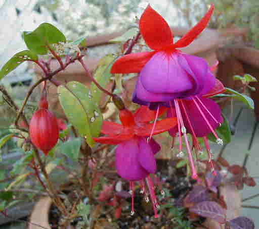 | 11/29(木) | フクシアが咲いています。そういえば生き残っているのはこの種類だけかも。 お気に入りのピーチピンクのが見当たりません×××。 お友達に教えてもらったのですが、松江のほうに”フォーゲルパーク””ルイス.C.ティファニー庭園美術館”というところがあるらしいの。どちらにもフクシアがあるって書いてありましたが、フォーゲルパークにはなんと1000種類のフクシアがあるらしいです。そうと聞いたらすぐ行きたくなるアニスです。3月とか4月に行けば珍しいフクシアが売ってるかな〜?どちらもHPがあるので探してみてねっ。 神戸では久しぶりの雨。ナメクジの喜んでる顔(?)が目に浮かびます。 1階のパンジーなんて植えた次の日から食べられて今では花が少ししかない状態で餌をやっているような気分です。今日のような日にがんばって捕獲に行くしかないかな?寒くないし・・・ 昨日はディスコロールセージもブルーサルビアもみーんなカットしてポットに移し替えました。もうぜんぜん花の無い屋上になってしまった〜。ワイルドストロベリーも植え替えしないとダメですね、実が小さくなっています。 |