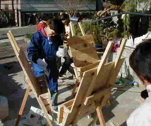 | 2002.03.28 メンバーさん有志によるイーゼル作り。 春のオープンガーデンに向けて、ガーデンショップにマップを置かせてもらう台としてみんなでイーゼルを製作。 木材は心ある業者さんが提供してくださり、下準備はホーリーさんとご主人の手でバッチリ済んでいたので、私達は釘やネジで組みたてていき、ニスを塗るだけで楽に完成することができました。 マップができあがったらこのイーゼルを積んで営業に出発だ〜! |