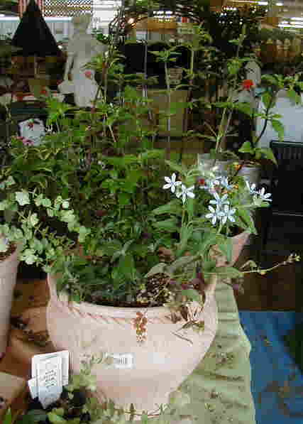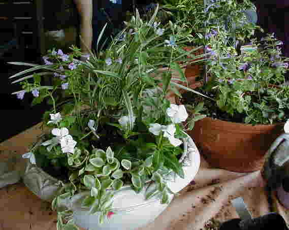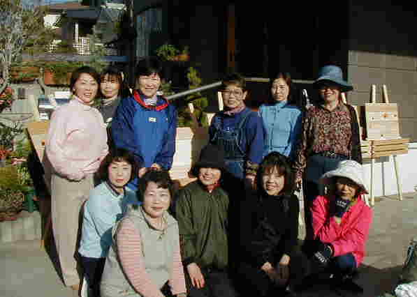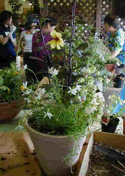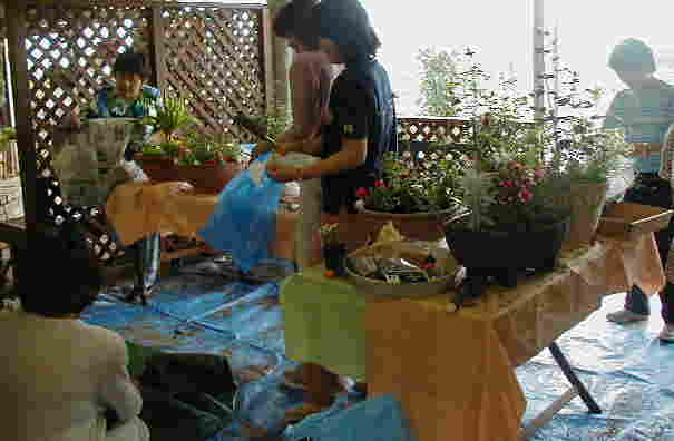 | 2001.6.22 寄せ植え教室を開催 (西区のガーデンステージオリーヴさんにて) 「庭主さんのお友達まで参加O.K.よ」という感じで、10名ほど集まりました。 講師アニスよりもベテランの方がほとんどなので、新しい品種のダリアやサルビアなどを使って素敵な寄せ植えがどんどん出来上がりました。 |