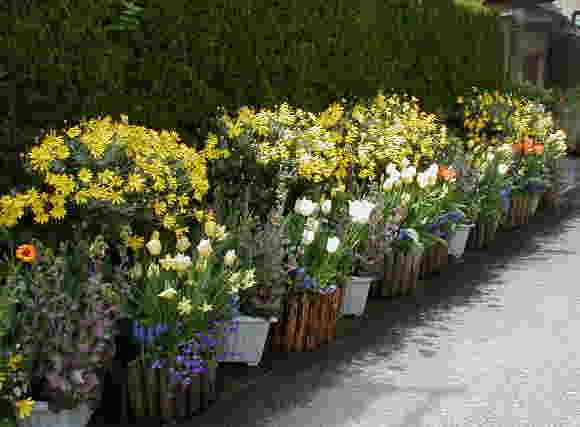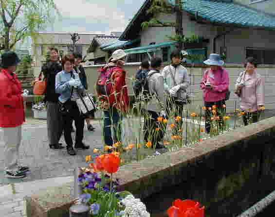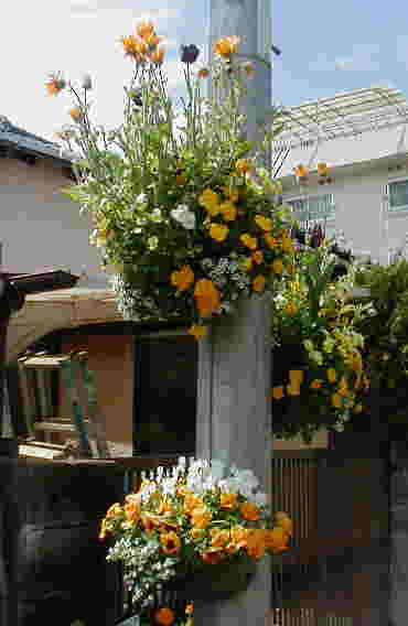 コンテナの中にはチューリップ以外にも隠し玉が!とても工夫されています。 大きい声では言えないけれど、電柱にもハンギングが! 台風の時には危険を考えて取り外すそうです。 この橋の上からお花通りが始まります。 この活動はもう10年にもなるそうです。 素晴らしい!! |