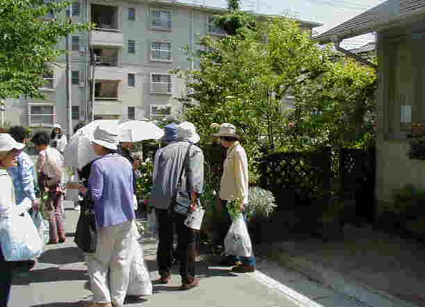 | 2001.7.26 亀岡市からオープンガーデンの視察? 亀岡市緑化協会の方と地元のお花の会の方がオープンガーデンを企画中とのことで私達すま花ネットに連絡が入り、この日暑い中ホーリーさんのお宅で集まりました。 遠くからわざわざ私達を頼って来てくださるなんて・・・なんて嬉しいことでしょう! ホーリーさんの「まず行動しましょうよ!」との力強い言葉が私達からのエールです。亀岡市の皆様、がんばって下さい! |