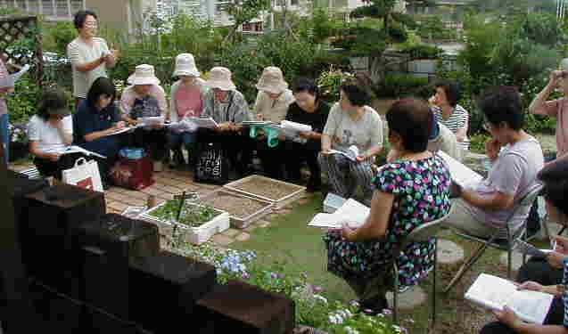 | 2001.9.6 9月の花パーティーで 「種まき講習会」 をしました。講師はたねまきおばさんとアニス、挿し芽の説明はホーリーさん。 早く発芽して花が咲いて、みなさんが種まき好きになってくれたらいいなぁ。。。 |