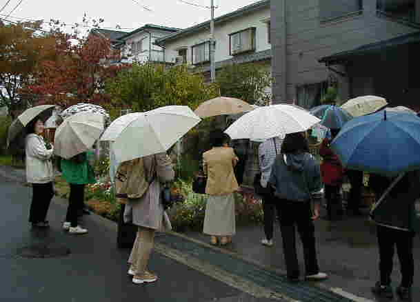 | 2001.11.3 coop「くらしの緑花塾」でオープンガーデンの見学にいらした皆様とホーリーさん宅で懇談。あいにくの雨の中3グループに分かれていくつかのお庭を歩いて回りました。 |