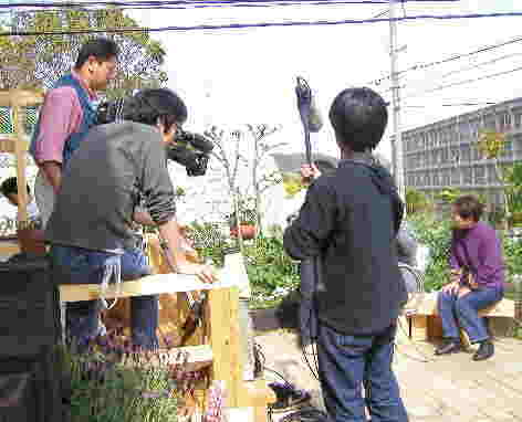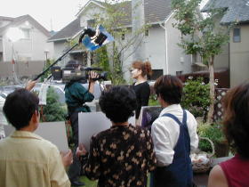 | 2001.10.5 NHK「ニュース関西発」の生放送 花ネットメンバーの南落合のお宅で中継。 こちらの庭主さんの後に手前の方たちが自宅の写真を持って一言というリハーサルの時の写真です。本番は暗くなってからでした。 |