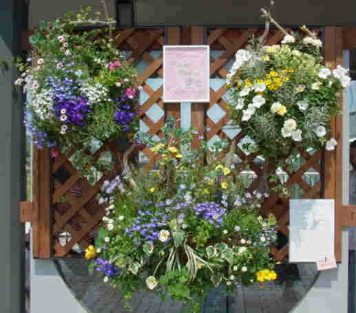たくさんのウォールバスケットが駅からアウトレットに続くプロムナードにかけてあり、すごい迫力。