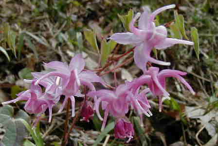 野草園のコーナーにこんな可愛いピンクのイカリソウ。右はヤブレガサ。