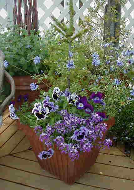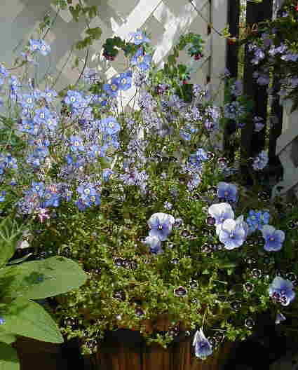 ヘリオフィラ、アスペルラ、セリンセ、パンジー、ネモフィラの樽