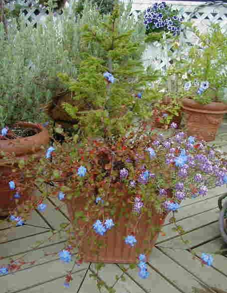 パンジーをブータンルリマツリに植え替えたもみの木の寄せ植え。