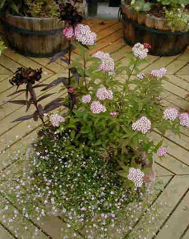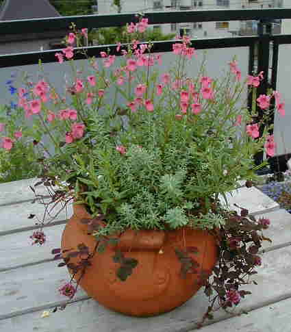 左:ディアスシア・エマと赤葉クローバーの寄せ植え手前には花の終わったハナカンザシが