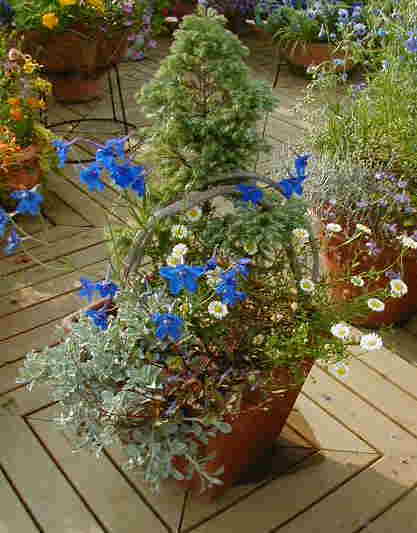 左:コニファー、デルフィニウム・シネンシス、ヘリクリサム、宿根ロベリア、ブラキカム