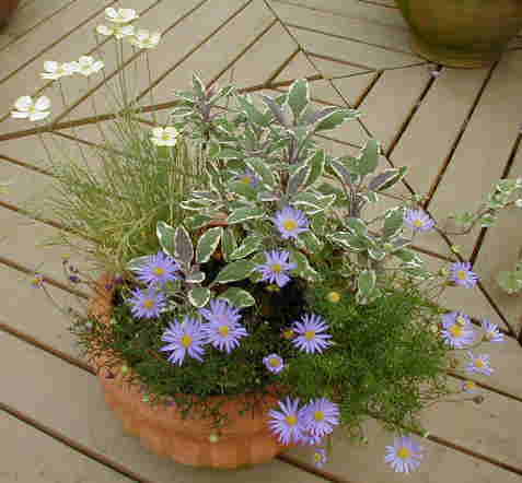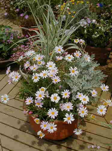 右:トワダアシ、マーガレット、白妙菊のシンプルな寄せ植え。
