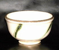 | テーマ展と小中作品展の二部構成となって おり、普段は大物を得意としている協会加入 の作家も、比較的求めやすい小振りの新作を 出品し、会場で展示即売されている。 テーマ展、今年のテーマは『めし碗』、得意 の作風や新たな意匠で、バラエティに富んだ 『めし碗』がずらりと並んでいた。この中で、 印象深く目に止まった作品があった。 加藤伸也作「緑彩碗」、白地に緑彩が上品に 走る小さめの作品、今年の せともの祭の記 念の品にすることにした。 |