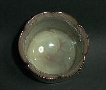 | 実に凛とした佇まいである。薄い黒褐色の器胎に掛かる釉の厚み、内外周に見 |