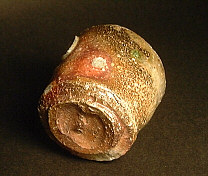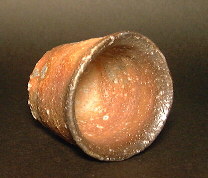 | 完全に融けきらず、器表に残る長石釉が、流れ落ち | 小粒のガイロ目を含む木目細かい陶土が鮮やかな朱色 | ||||||||